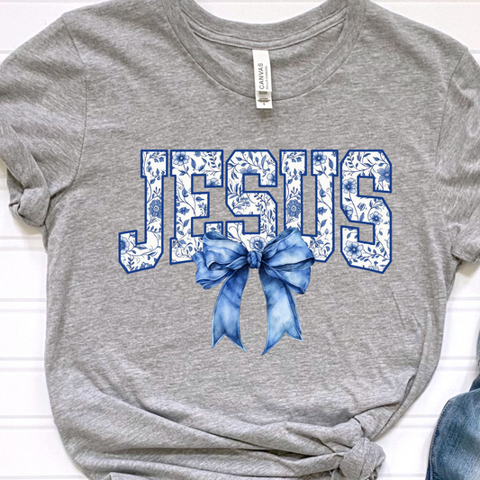 Jesus Blue and White Floral Grey Graphic Tee